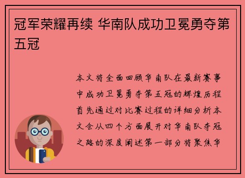 本文将全面回顾华南队在最新赛事中成功卫冕...