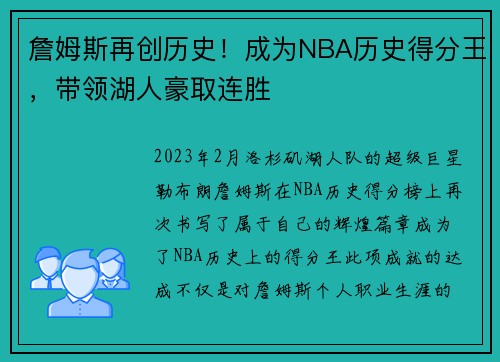 2023年2月,洛杉矶湖人队的超级巨星勒...