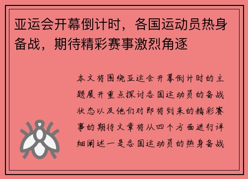 本文将围绕亚运会开幕倒计时的主题展开,重...