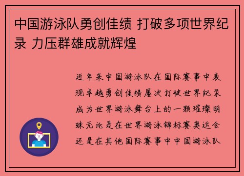 近年来,中国游泳队在国际赛事中表现卓越,...